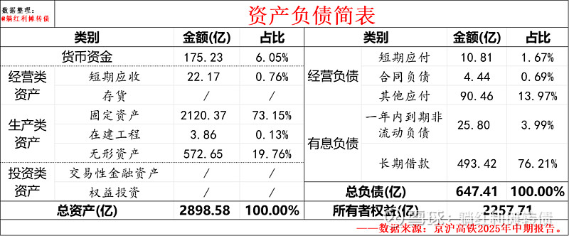 上图是躺师傅根据京沪高铁2025年中报制作的资产负债简表,可以看到京沪高铁的资产端九成以上都是固定资产和无形资产,剩下的资产基本都是货币资金,负债端以长期借款为主,资产负债表相当的扎实且干净,财务杠杆极低,完全有能力加大分红力度。