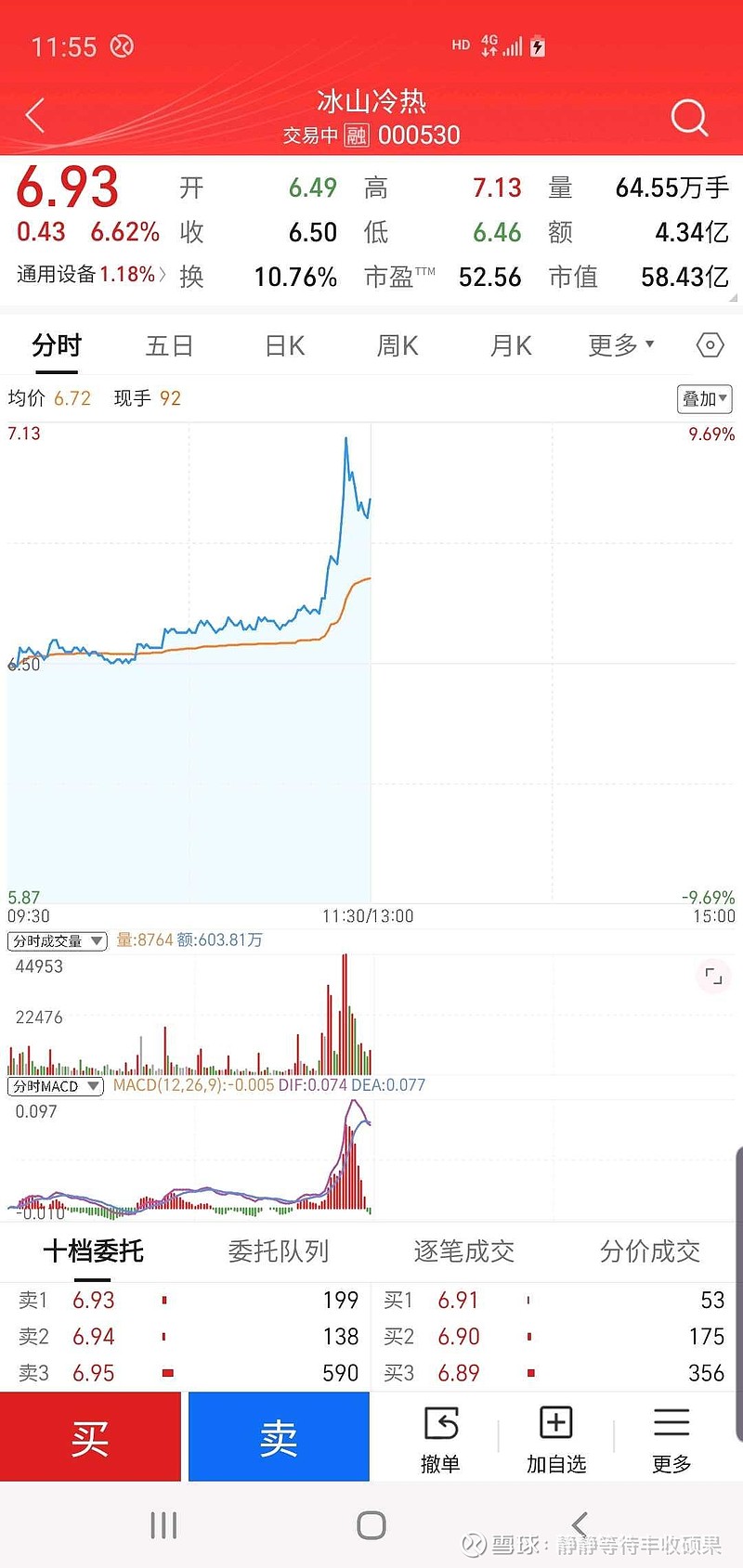 今日短线操作:一,开盘9元45出中国交建(重仓,成本9元33,盈利2.3万),切换5元76一78中国中铁(暂亏损0.2万)。二,10元66入莱绅通灵,10元90出降成本为11元(暂亏损0.25万)。三,翠微股份没动仓(暂持平)。现莱绅通灵与翠微股份为轻仓,中国中铁为重仓。四,下午准备华银电力或国际复材开个新的轻仓。五,周三6元39一44入,周四6元35加仓,周五6元50清仓的冷山冷热今日涨停差2分又卖飞。