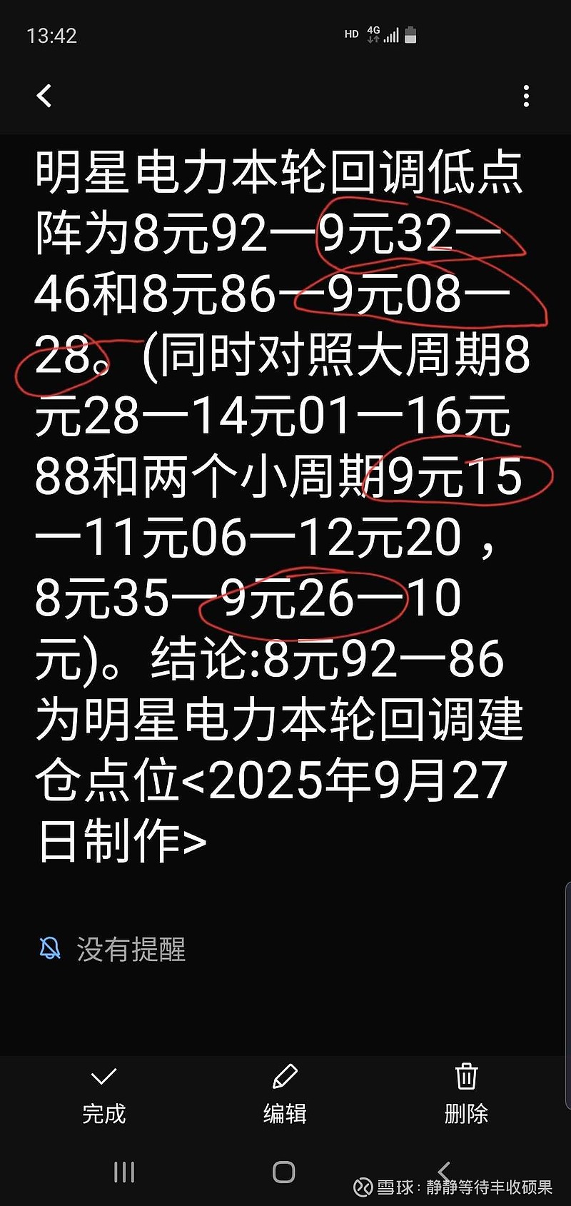 今日操作:一,今日开始逐步建仓明星电力(9元32一34一38一45)。友情提示:电力及电力关联行业己充分回调到位,可以正式开始建仓<明星电力正式启动主仓建仓点根据实际趋势上修一个点阵区间,正式开启建仓(预期第二种回调低点阵的9元08(10)点阵为本轮最低回调点)>。二,华测导航维持预期,从逻辑上应走一波预期行情<今日预期冲击36元30(38)一76一37元11(18)点阵。