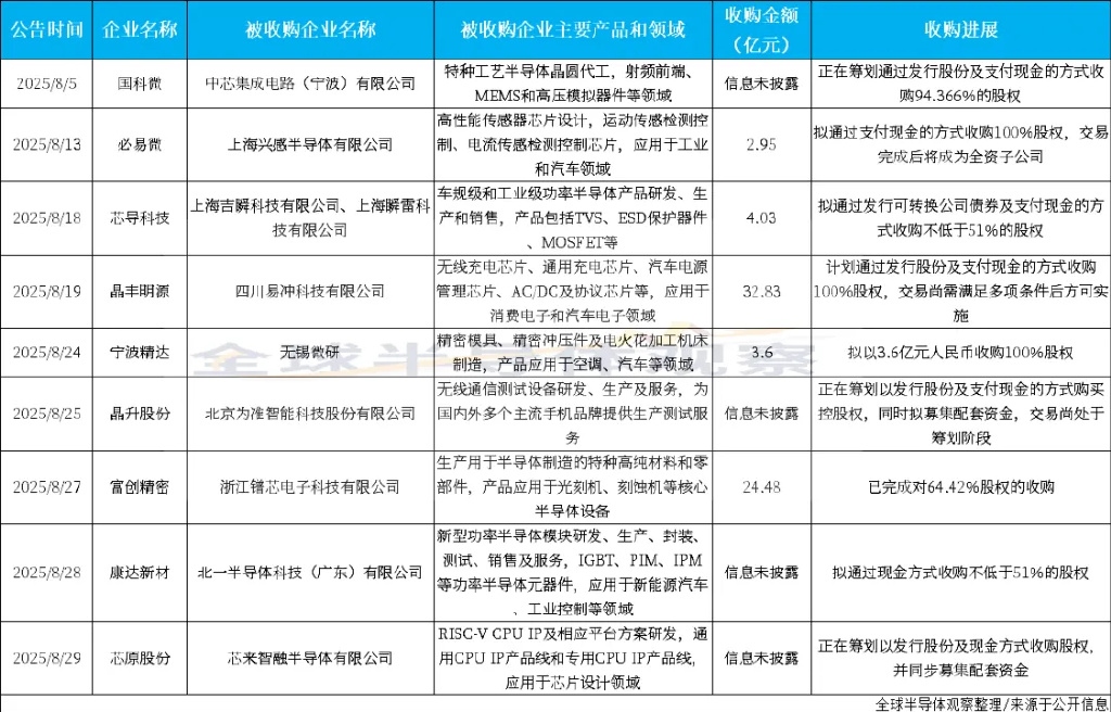 进入2025年下半年,中国半导体行业的并购活动显著升温。据统计,仅在8月,就有近10家上市公司披露了重要的并购或股权投资计划。