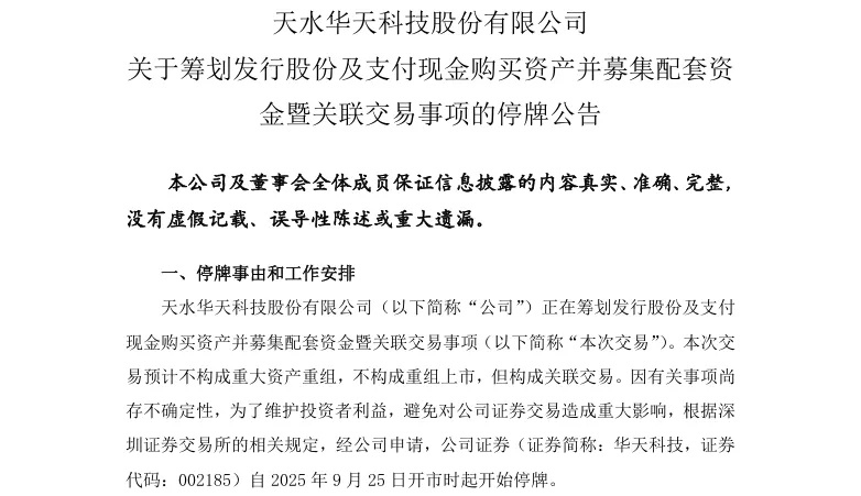 2025年9月24日晚间,封装测试厂商华天科技宣布,正在筹划通过发行股份及支付现金的方式,收购其控股股东旗下的华羿微电子股份有限公司(简称“华羿微电”)。公司股票自2025年9月25日起停牌,预计停牌时间不超过10个交易日,最晚于10月17日复牌并披露相关方案。