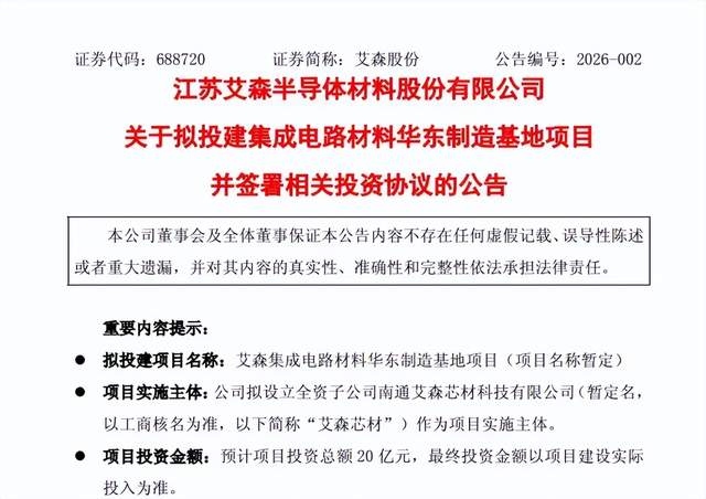 1月27日,艾森股份发布公告,拟投资20亿元在南通市经济技术开发区投建集成电路材料华东制造基地项目,设立全资子公司南通艾森芯材科技有限公司作为实施主体。