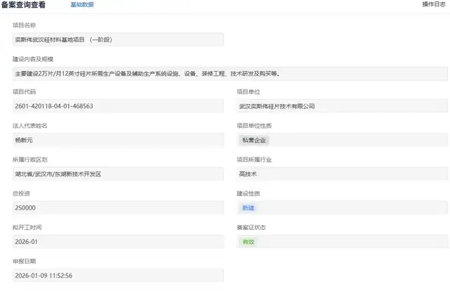 1月9日,武汉奕斯伟硅片技术有限公司的硅材料基地项目(一阶段)完成备案,并计划于当月启动建设。
