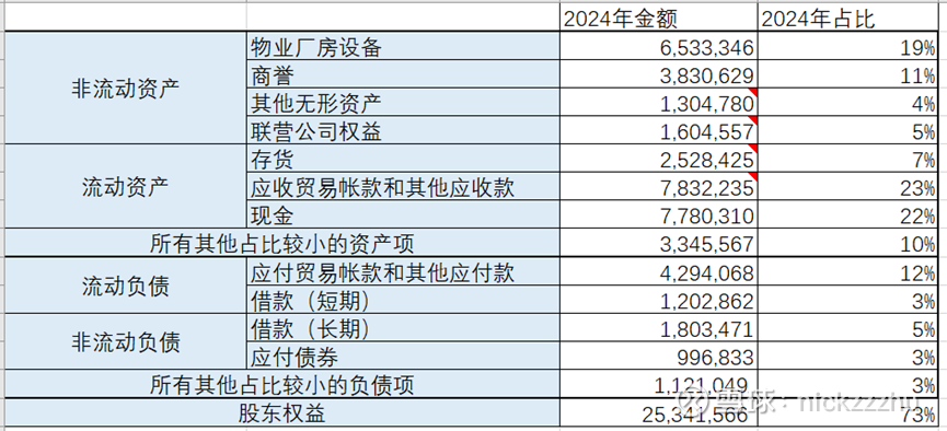 以上的近似现金流=利润+折旧摊销-资本开支。2023-2024年,用现金流做分子,介入业务的现金流/收入比率在13%-14%,和骨科、血液管理分部利润率没什么显著差别,明显比医疗器械、药包板块要差。现金流/资产的比率在5%,看上去不是个高效的、赚钱的业务。从资产构成来看,商誉占资产的绝对大头(~60%)