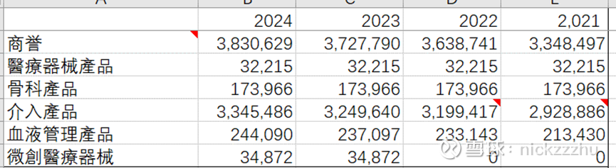 最后单独看一下介入。因为是收购的业务,一方面有大额商誉,另一方面有无形资产摊销。把介入的资产、商誉、收入、利润、摊销放在一起看一下: