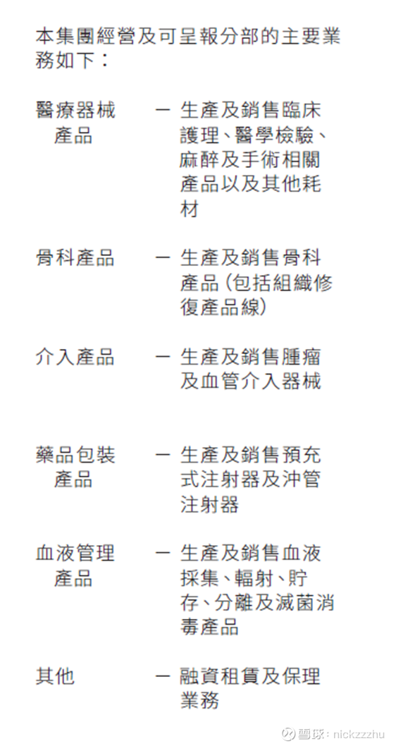 威高当前的业务板块包括医疗器械、骨科、介入、药品包装、血液管理、其他(融资租赁和保理)。具体的业务如下