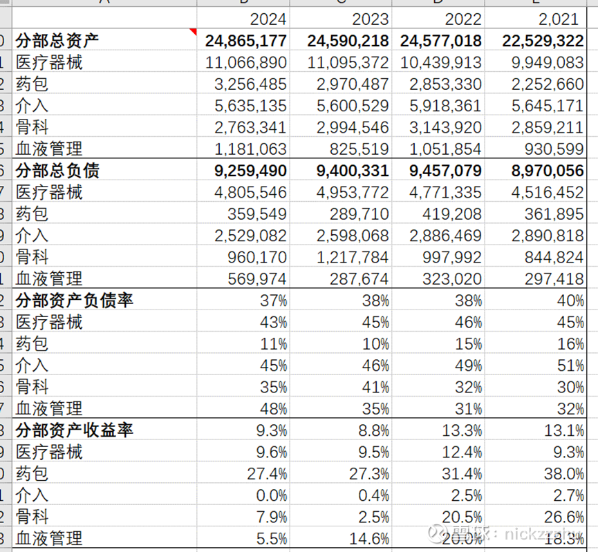 医疗器械是稳的:资产负债率稳定,资产收益率虽然低但也稳定(剔除2022年特殊情况的影响),可以认为是个稳定的压舱石业务,能提供稳定的现金流入,很难被别人颠覆,但短期也不会有什么惊喜