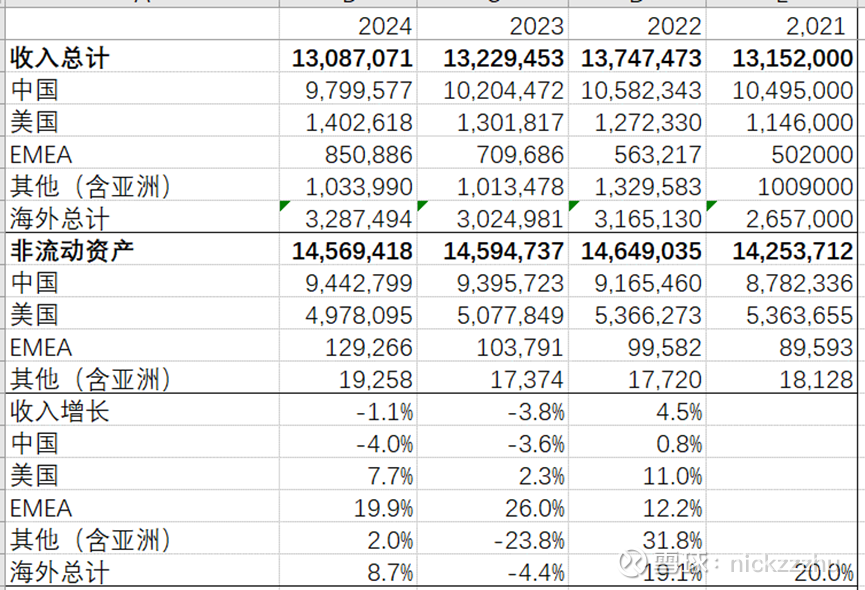 从以上数据可见,海外收入的增长主要在美国和欧洲,亚洲部分的增长并不好看。此外公司在海外资产并不多,美国部分的非流动资产一直在萎缩,欧洲和亚洲的资产明显匹配不上收入,因此我认为公司的出海就是中国制造出口,对外的核心竞争力和其他制造业没什么明显不同(即中国强大的制造业能力和廉价劳动力)