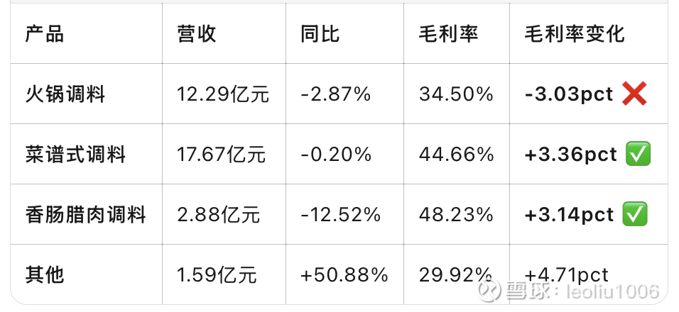 火锅调料(公司的核心业务)营收下降,毛利率也下降——这是双重打击