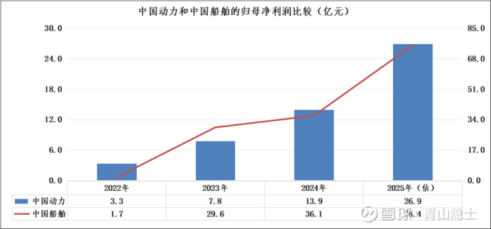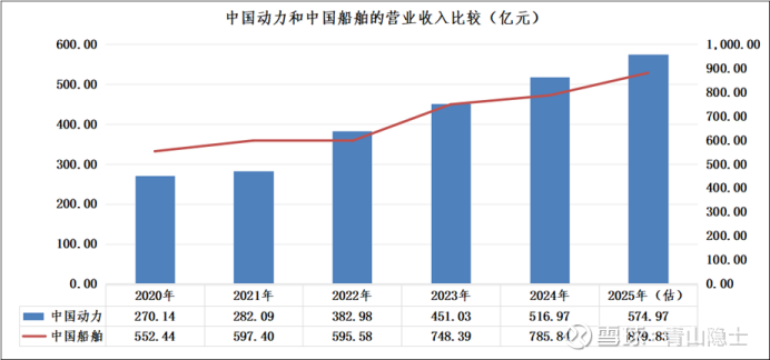 如果我们把时间区间从5年调整为3年,从2022年至2025年(估),中国动力和中国船舶的年收入涨幅分别为50.1%和47.7%。可以发现,两者的收入增速开始趋同。