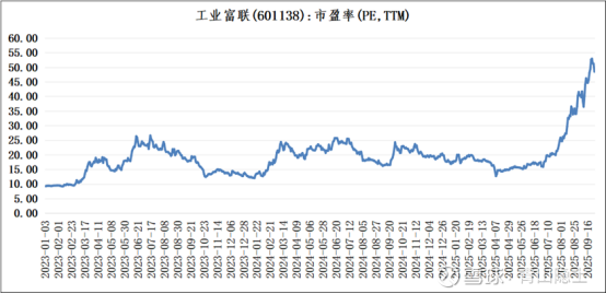 至7月30日,工业富联发布2025年半年度预告,明确上半年利润增速为38.61%,其中,二季度利润同比增加51.1%。在市场情绪推动下,工业富联的市盈率(TTM)被迅速拉升至52倍左右,如今回落至48.5倍。