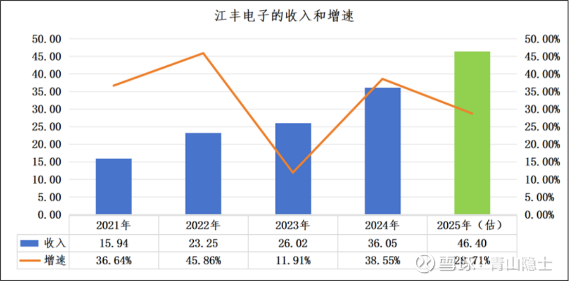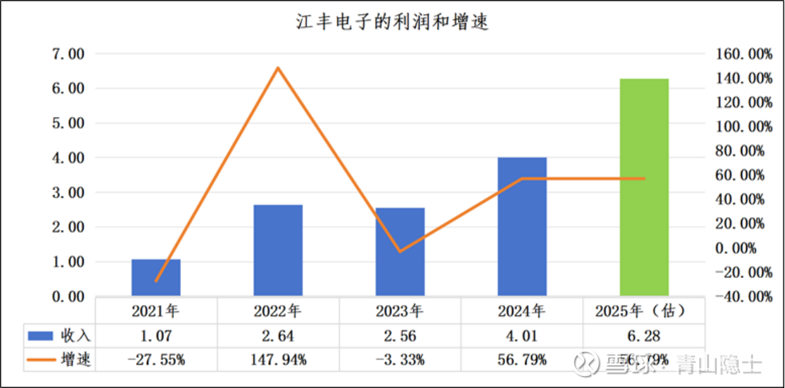 从收入角度看,从2021年至2025年(估),江丰电子的年收入预计将从15.94亿元增加至46.4亿元,年复合增长率约为30.6%。从利润角度看,从2021年至2025年(估),江丰电子的年利润(归母净利润)预计将从1.07亿元增加至6.28亿元,年复合增长率约为55.6%。