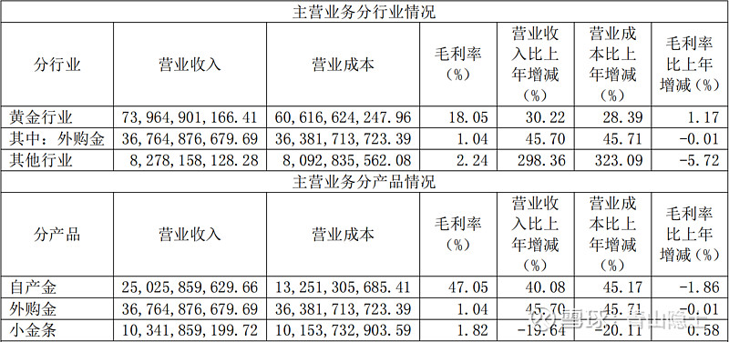 根据山东黄金2024年年报,2024年山东黄金营收825.18亿元,其中,自产金收入250.26亿元,占比30.3%,毛利率47.05%;外购金收入367.65亿元,占比44.6%,毛利率1.04%;小金条103.42亿元,占比12.5%,毛利率1.82%。
