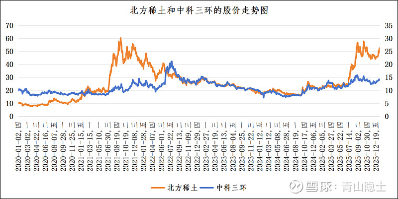 2022年6月至2025年6月的三年时间窗口内,北方稀土与中科三环的股价走势呈现出极强的关联性,二者股价大致呈现“北方稀土股价=2×中科三环股价”的数量关系。