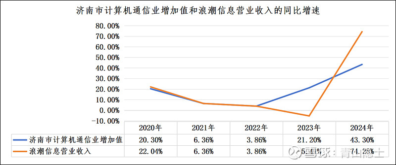 根据济南市统计局披露的资料,2023年、2024年济南市计算机通信业增加值同比增速分别为21.2%、43.3%,两年增速呈现显著跃升态势。2020年该行业增加值同比增长20.3%,同期浪潮信息营业收入同比增速达22.04%,二者走势大体一致。