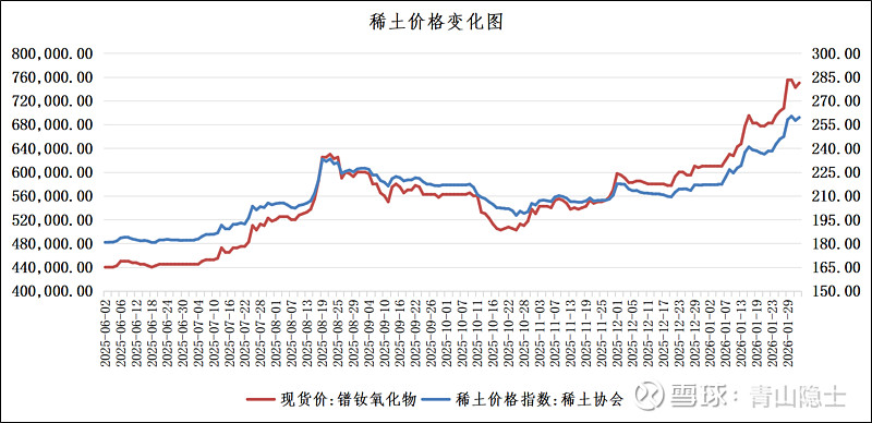 值得关注的是,自1月23日以来,镨钕氧化物现货价的涨幅(9.9%)略高于稀土价格指数的涨幅(8.9%)。尤其是在1月29日,镨钕氧化物现货价出现大幅跳涨,单日涨幅接近6.7%,较前一日上涨约47500元/吨,这一走势与盛和资源当日收获涨停的表现形成直接呼应。尽管近期金银铜铝等金属价格经历大幅波动,稀土价格走势却相对稳健,基本面支撑强劲。