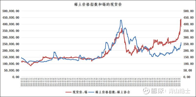 从这张“稀土价格指数和锡的现货价”走势对比图可以清晰地看到,两者价格走势呈现出高度的一致性。从2015年至今,无论是2020年之前的低位震荡筑底,还是2020年后同步启动的上升周期,抑或2021—2022年共同触及阶段性高点后的回落调整,以及2023年以来的再度反弹,两条曲线的波动节奏与趋势方向几乎完全同步,印证了“工业维生素”在产业逻辑、供需格局和市场情绪上的紧密联动效应。