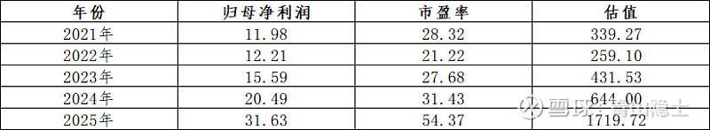 2021年归母净利润11.98亿元,测算估值339.27亿元;2022年12.21亿元,测算估值259.10亿元;2023年15.59亿元,测算估值431.53亿元;2024年20.49亿元,测算估值644.00亿元;2025年31.63亿元,测算估值1719.72亿元,整体随盈利增速提升持续走高。