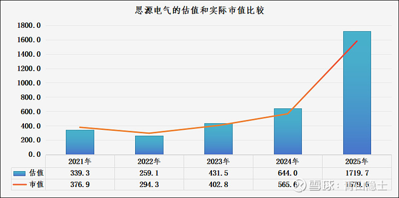2021年测算估值339.3亿元,实际市值376.9亿元;2022年测算估值259.1亿元,实际市值294.3亿元;2023年测算估值431.5亿元,实际市值402.8亿元;2024年测算估值644.0亿元,实际市值565.6亿元;2025年测算估值1719.7亿元,实际市值1579.6亿元。