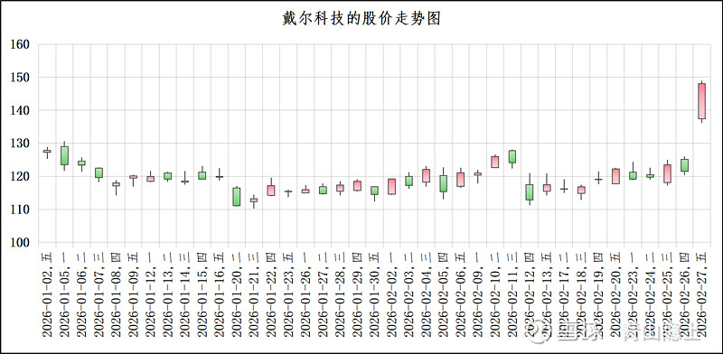 2月26日,戴尔科技美股股价单日大涨21.93%,主要得益于其亮眼的2026财年第四财季财报。当季公司营收334亿美元,同比增长39%,超出市场预期的317亿美元;基础设施解决方案集团营收196亿美元,同比增长73%,AI优化服务器收入90亿美元,同比激增342%,均创下历史新高。非GAAP稀释后每股收益3.89美元,同比增长45%,高于分析师预期的3.52美元。2026财年全年营收1135亿美元,同比增长19%,同样刷新历史纪录。