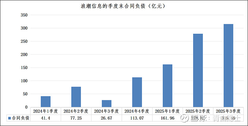 与戴尔科技的订单高增形成呼应,浪潮信息的合同负债数据同样印证了国内AI服务器行业的强劲增长动能。从2024年一季度到2025年三季度,浪潮信息的季度末合同负债呈现出阶梯式攀升态势:2024年一季度为41.4亿元,到2025年三季度已激增至315.45亿元,短短7个季度内增长超过6.6倍,这一增速直观反映了浪潮信息在手订单的持续爆发。