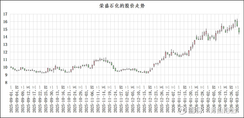 从荣盛石化的股价走势来看,2025年9月至2026年3月初,公司股价经历了“震荡筑底—稳步抬升—加速上行—高位回调”的完整阶段。2025年下半年,股价在9-11元区间反复震荡,反映出市场对炼化行业盈利修复的谨慎预期;进入2026年后,随着PTA行业毛利率从低位持续修复至20%以上,公司股价同步开启强势上行,从10元附近一路攀升至16元上方,充分反映了盈利改善带来的估值与业绩双击。