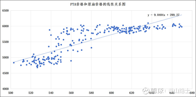 在《荣盛石化等化工股的周期投资逻辑》一文中,基于2024年“原油主连”与“PTA主连”的日K线数据进行散点图拟合后,我们得到了两者的相关性方程:Y=9.0484X+299.27。这一结果意味着,在2024年的市场环境下,PTA价格大致可以简化为“原油价格的9倍加上300元”的线性关系,为投资者和产业端快速预判PTA价格走势提供了一个简洁实用的量化参照。