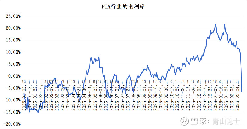 这一轮毛利率修复,主要得益于PTA价格与成本端的错配改善,叠加下游需求阶段性回暖,使得行业盈利空间被持续打开。然而,进入2026年2月后,随着国际油价的大幅冲高,原油成本快速抬升,直接挤压了PTA环节的利润空间,行业毛利率出现断崖式回落。