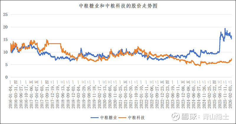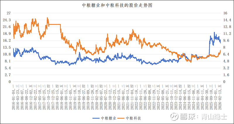 尤其2024年四季度至2026年初,分化格局进一步加剧:中粮糖业受食糖行业景气度上行催化,股价迎来一轮强势主升行情,从10元附近区间最高冲高至近20元,区间涨幅接近翻倍;而同期中粮科技仅出现小幅跟涨,股价始终在5-8元的低位区间震荡,二者股价价差创下2016年以来的历史新高,此前长期稳定的联动格局被阶段性打破。