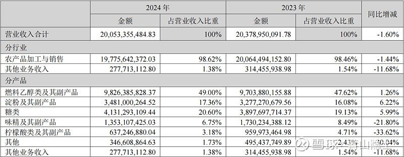 反观中粮科技,根据其2024年年报,公司以农产品加工为核心主业,收入占比近99%。其中,燃料乙醇类及其副产品为第一大收入来源,占营收近半;糖类与淀粉及其副产品分别以20.60%和17.36%的占比构成第二、第三大业务板块,且糖类、淀粉类收入均实现正增长,而味精、柠檬酸等传统品类收入则有所下滑。