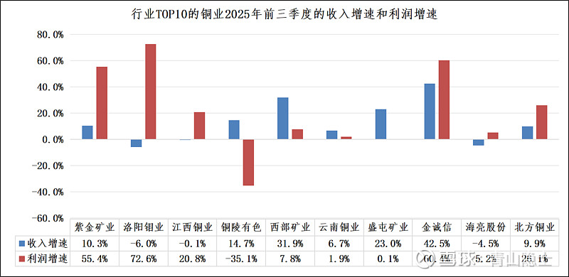 洛阳钼业与江西铜业则成为“利润驱动型”的典型代表,展现出老牌铜企极强的经营韧性。洛阳钼业尽管收入同比下滑6.0%,但通过极致的成本优化和产品结构升级,实现了72.6%的利润高增长,盈利效率大幅提升;江西铜业在收入基本持平(-0.1%)的情况下,依然录得20.8%的利润增速,充分体现了其在产业链中的核心地位与精细化管理能力。