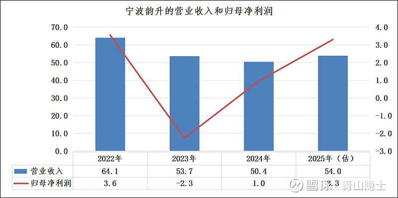 从营收维度来看,宁波韵升的经营规模已走出阶段性低谷。2022—2023年公司营业收入从64.1亿元下滑至53.7亿元,2024年进一步回落至50.4亿元,呈现连续两年收缩态势;而2025年营收预计回升至54.0亿元,较2024年实现同比增长,标志着公司营收端率先触底反弹,业务规模逐步扩张,为后续盈利改善奠定了坚实的业务基础。需说明的是,2025年营收数据为基于前三季度增速乘以2024年营业收入的估算值,非官方实际披露数据。