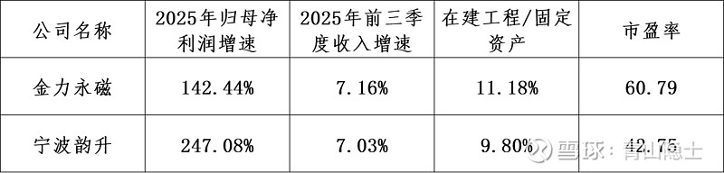 从核心经营指标来看,宁波韵升的成长韧性不输于龙头金力永磁。2025年宁波韵升归母净利润增速达247.08%,显著高于金力永磁的142.44%,盈利端的修复弹性更为突出;收入端两者基本持平,宁波韵升前三季度收入增速7.03%,金力永磁为7.16%,业务扩张节奏一致。产能布局上,宁波韵升在建工程/固定资产占比9.80%,接近金力永磁的11.18%,产能储备充足,为后续业绩持续释放提供坚实支撑,成长性完全具备对标龙头的资质。