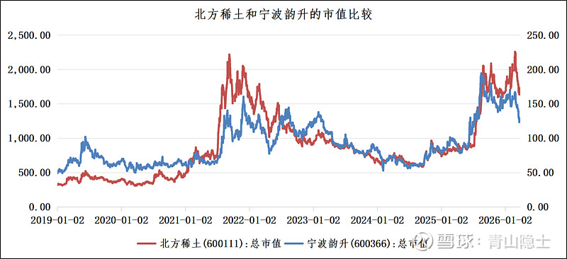 从长期市值走势来看,北方稀土与宁波韵升的股价波动高度同步,两者市值长期维持在约10倍的量级差,体现出较强的相关性。