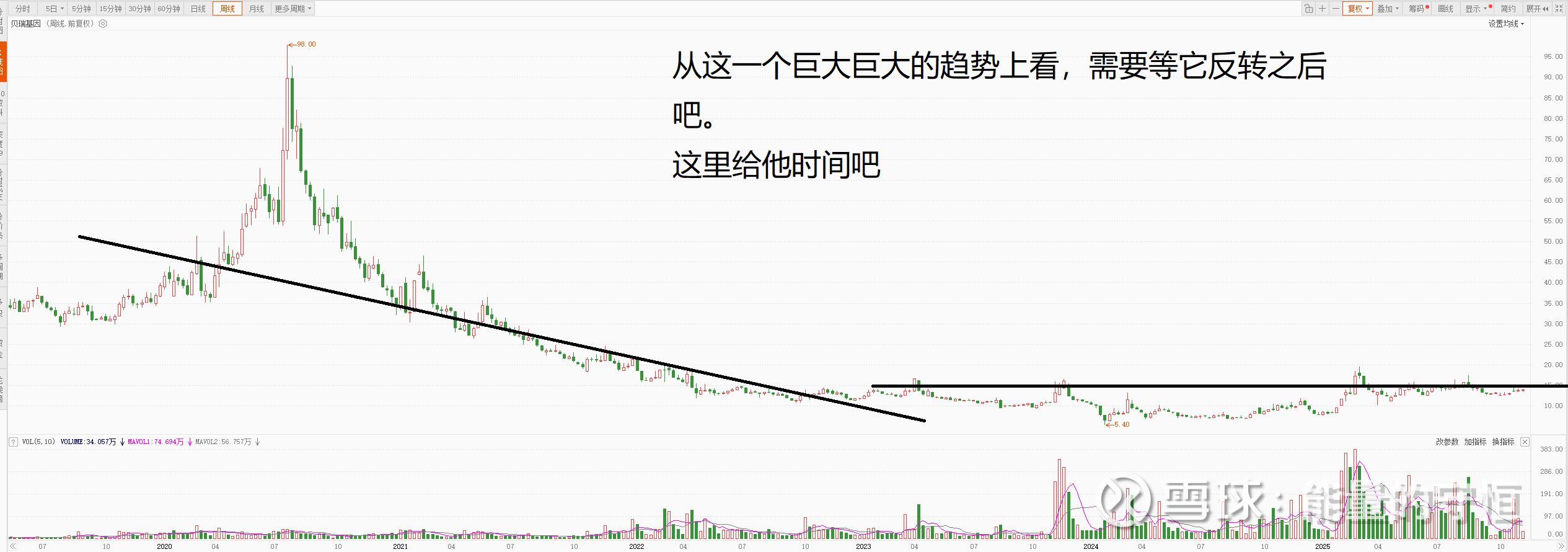 从这一个巨大巨大的趋势上看,需要等它反转之后吧。 这里给他时间吧