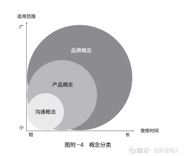 圆圈越大,覆盖的领域越广,对应的概念也越能够长时间使用,具备广泛的适用性。与之相反,圆圈越小,越需要在表达上聚焦于一点。在理解了这一普遍规律的基础上,我们可以分别深入地思考每一种概念。