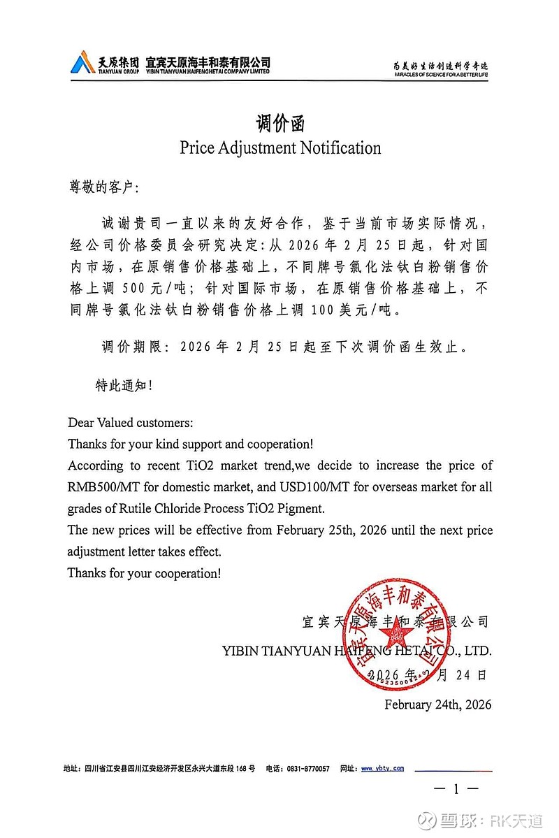钛白粉提价100美金