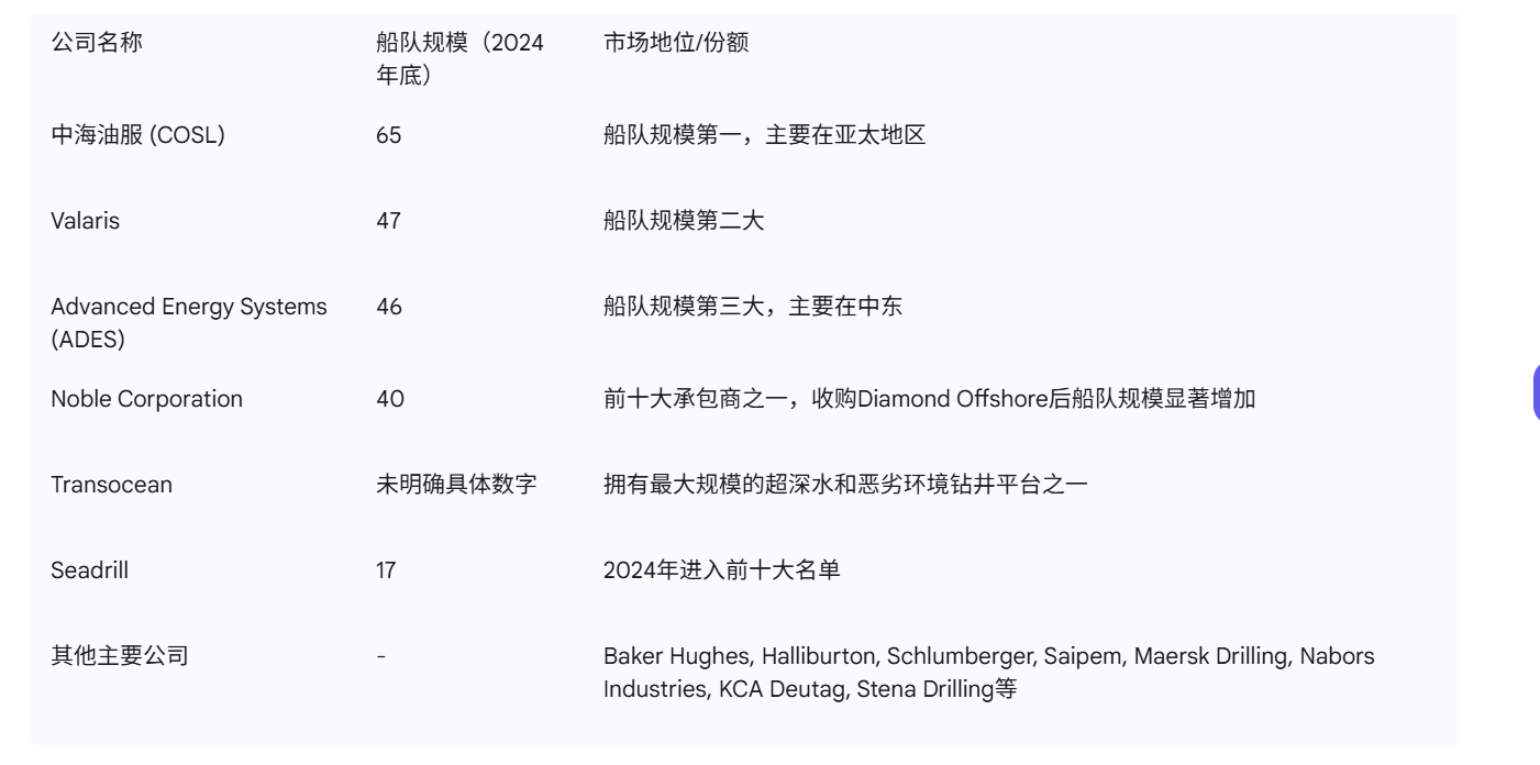 竞争格局由贝克休斯、哈里伯顿、斯伦贝谢和Transocean等主要参与者主导,这些公司凭借其技术专长、丰富经验和全球影响力占据了显著的市场份额 13。其他主要参与者包括Seadrill、Valaris、中海油服(COSL)和Noble Drilling 12。截至2024年底,前十大钻井承包商控制了全球近51%的船队 9。Noble Corporation于2024年9月完成了对Diamond Offshore的收购,使其管理的船队增加到40个钻井平台 9。公司在技术卓越性上展开激烈竞争,不断投资研发以提高效率、降低环境影响和增强安全性 13。过去十年,近海钻井行业经历了大量的并购活动,其驱动因素是追求规模经济、获取技术以及在周期性市场中的整合 13。