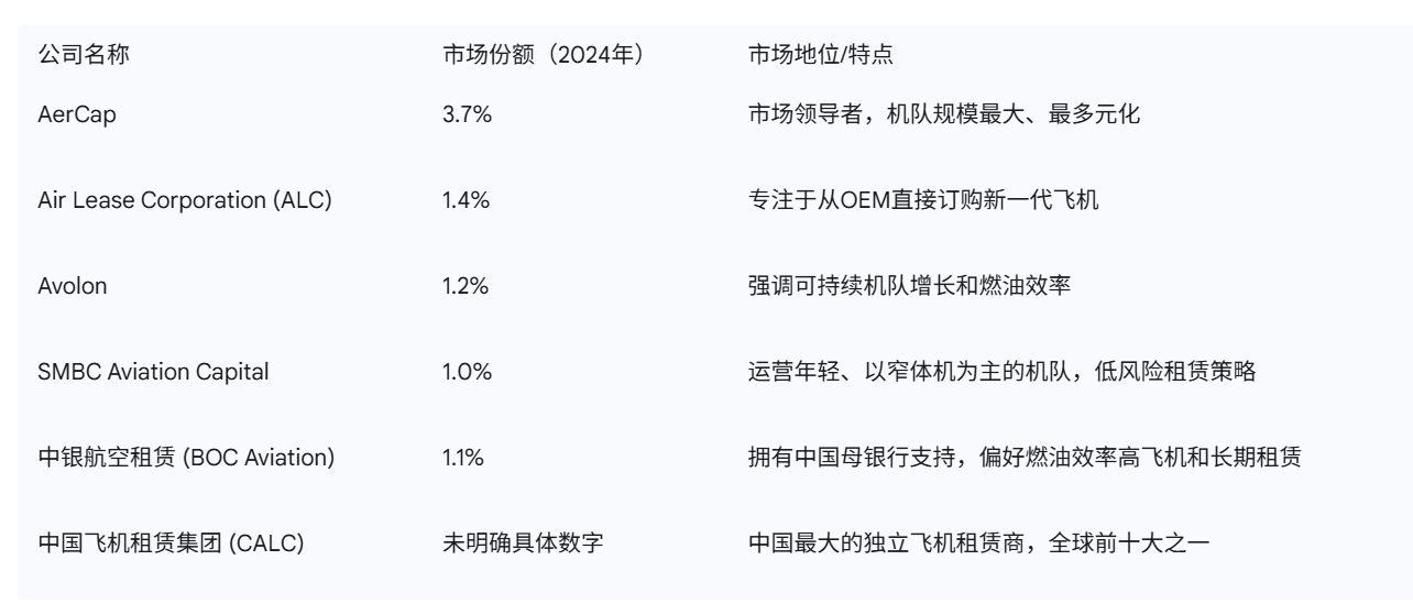 全球飞机租赁市场是分散的 32。主要全球参与者包括AerCap(2024年市场份额3.7%)、Air Lease Corporation(1.4%)、Avolon(1.2%)、SMBC Aviation Capital(1%)和中银航空租赁(BOC Aviation,1.1%) 17。这五家公司合计占据了超过8.4%的市场份额 17。中国飞机租赁集团是中国最大的独立飞机运营租赁商,按机队和订单总资产价值计算,是全球前十大飞机租赁商之一 5。中国因政府对航空扩张的强劲支持而占据区域市场份额的主导地位 33。竞争主要由机队规模、财务支持以及获得新一代飞机订单的能力驱动 17。