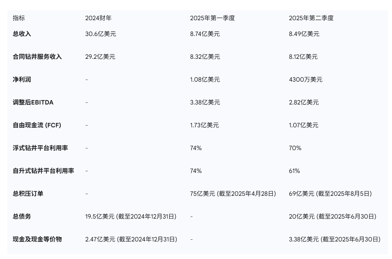 Noble Corporation在2024-2025年的财务表现展现出其在挑战性市场中的韧性。公司2024财年总收入为30.6亿美元,其中合同钻井服务收入为29.2亿美元 3。2025年第一季度,总收入达到8.74亿美元(高于2024年第一季度的6.37亿美元),净利润为1.08亿美元,调整后EBITDA为3.38亿美元,自由现金流(FCF)为1.73亿美元 39。浮式钻井平台和自升式钻井平台的利用率均为74% 39。然而,2025年第二季度,总收入降至8.49亿美元(较第一季度下降,但较2024年第二季度增长22%),净利润大幅下降至4300万美元(远低于2024年第二季度的1.95亿美元和2025年第一季度的1.08亿美元),调整后EBITDA为2.82亿美元,FCF为1.07亿美元 40。浮式钻井平台利用率降至70%,自升式钻井平台降至61% 40。公司对2025年的指引进行了调整:总收入下调至32亿-33亿美元(此前为32.5亿-34.5亿美元),调整后EBITDA上调至10.75亿-11.5亿美元(此前为10.5亿-11.5亿美元),资本支出(扣除补偿后)上调至4亿-4.5亿美元(此前为3.75亿-4.25亿美元) 40。