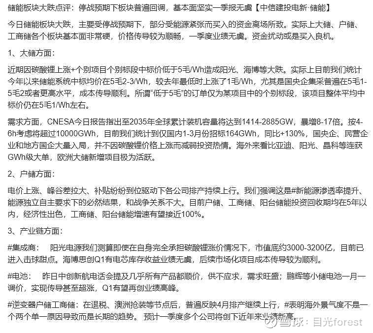 阳台储能增速有望接近100%。逆变器户储工商储:在退税、澳洲抢装等节点后,普遍反映4月排产继续上行。(阳台储能,问你话呢小安克创新,阳台储能细分赛道冠军)另外阳光电源电话会Q1储能环比增速60%;全年营收指引同比23-35%,归母利润同比26-41%。
