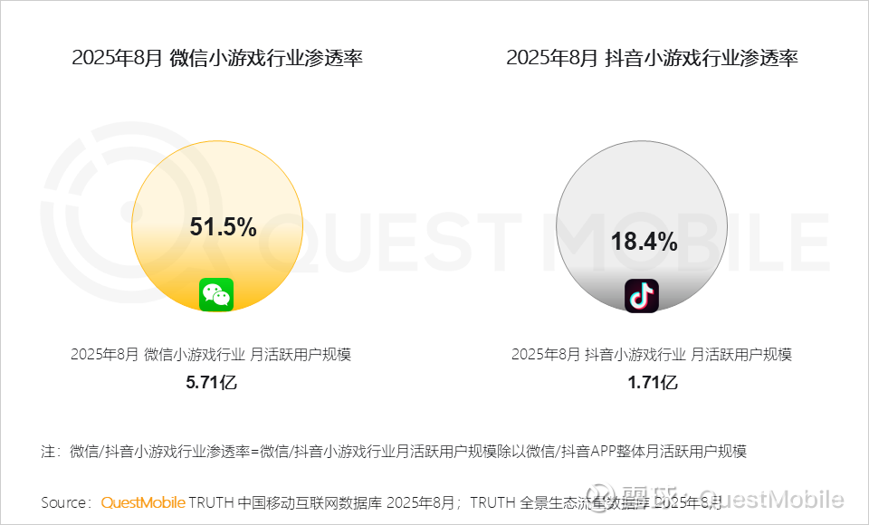 微信小游戏以51.5%渗透率和5.71亿月活跃用户规模领跑,抖音小游戏则凭借18.4%渗透率和1.71亿月活跃用户规模快速追赶,共同驱动小游戏生态快速发展。