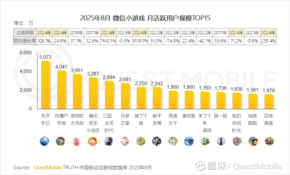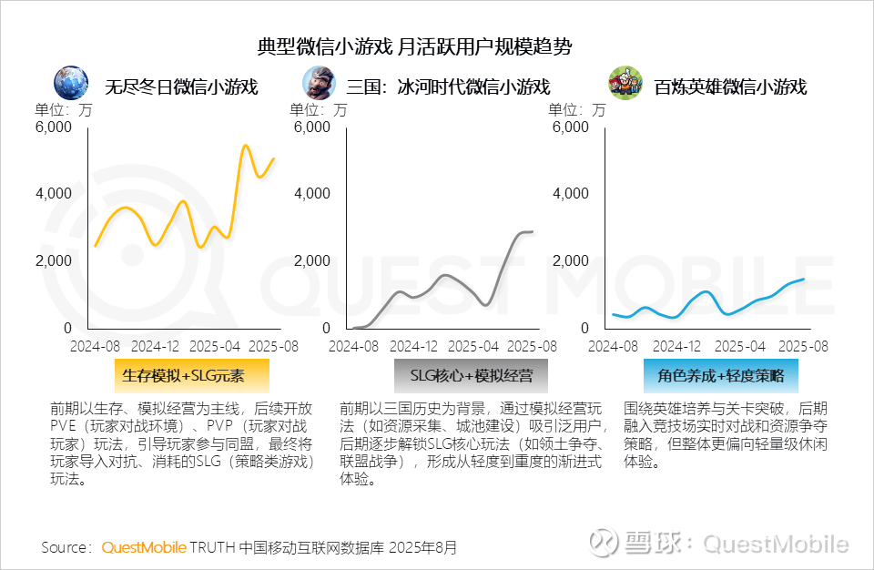 3、中度化与混合玩法成为微信小游戏增长的关键引擎,《无尽冬日》《三国:冰河时代》《百炼英雄》均通过融合轻度休闲体验与中重度核心玩法,实现了用户规模的显著增长
