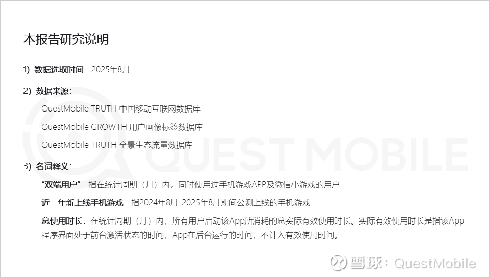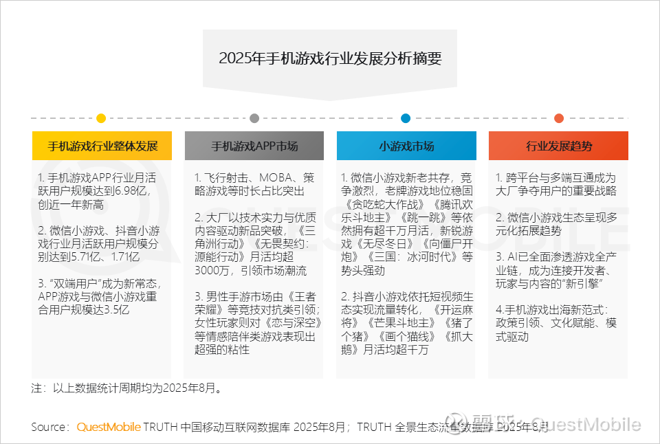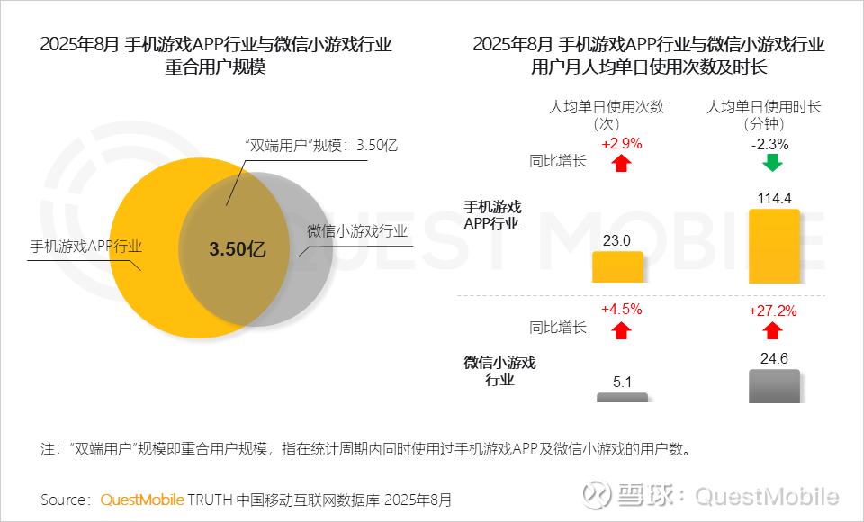 手机游戏APP专注于深度沉浸体验,满足用户长时间高质量娱乐需求,QuestMobile 2025年8月数据显示,手机游戏APP行业人均单日使用次数和时长分别达到23次和114.4分钟;微信小游戏则以轻量化、碎片化特点,提供便捷快速的游戏体验,两者互为补充,满足了用户在不同场景下的多样化需求。