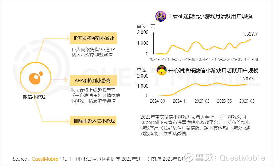 2、微信小游戏生态呈现多元化拓展趋势微信小游戏正成为连接优质内容与广泛用户的重要载体,头部IP(如《征途》)和成熟APP(如《开心消消乐》)的持续入局,验证了“大内容+轻平台”的复用路径;Supercell等国际厂商的进入,表明其社交化场景正吸引外部关注,平台内容日趋多元。