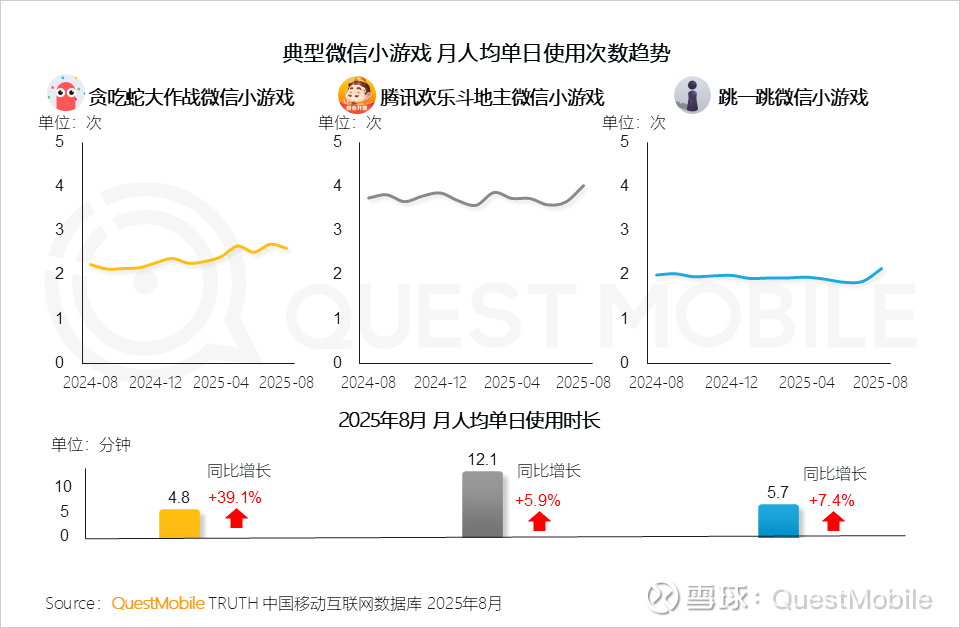 4、经典微信小游戏进入“深耕期”,用户单日使用频次稳定、时长持续增长,彰显成熟产品在长期运营中实现用户粘性与时间投入双提升的持久生命力