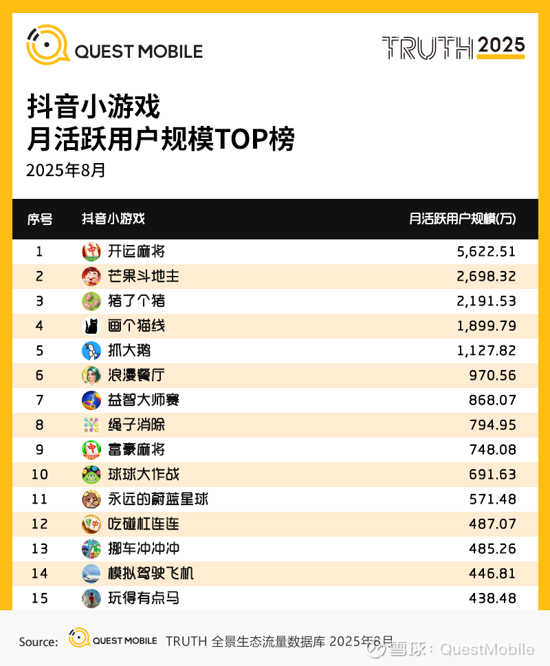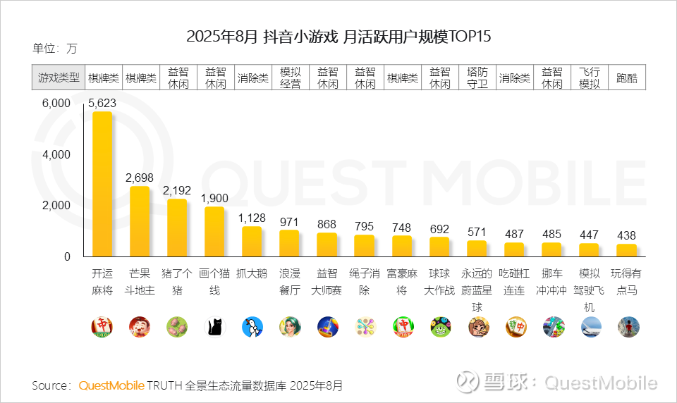 QuestMobile数据显示,2025年8月,抖音小游戏中棋牌类、益智休闲等品类表现突出,其中,《开运麻将》凭借5623万的月活跃用户规模领跑抖音小游戏,《芒果斗地主》《猪了个猪》《画个猫线》《抓大鹅》月活跃用户规模均超千万,展现出强劲的用户吸引力。
