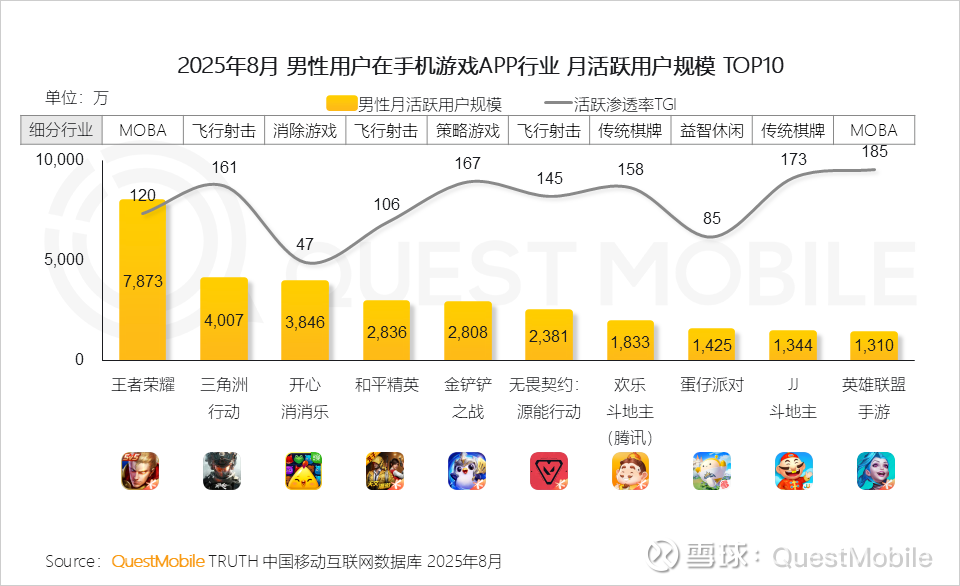 5、男性手游市场由《王者荣耀》引领,MOBA与飞行射击类占据主导,显示出男性用户对竞技对抗和操作类玩法的持续偏好,同时策略、棋牌等多元品类共同支撑,形成“竞技为王、多维并存”生态格局