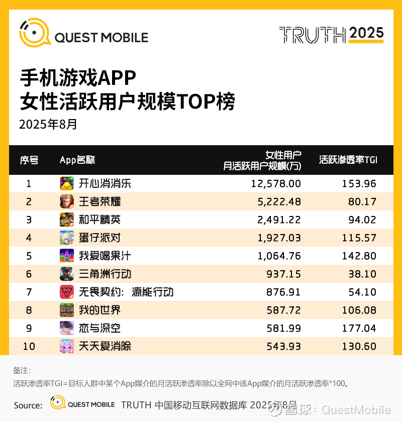 6、女性用户在手机游戏市场中的影响力持续增强,对模拟经营、益智休闲及消除类等游戏偏好明显QuestMobile数据显示,《开心消消乐》凭借强社交与轻度休闲属性吸引超七成女性用户,《恋与深空》以情感共鸣和IP运营吸引用户,活跃率达64.8%,远超行业平均水平,在增强女性游戏玩家的粘性和长期留存方面表现卓越。