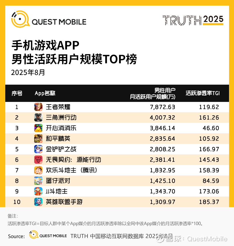1、手机游戏APP 男性活跃用户规模TOP榜